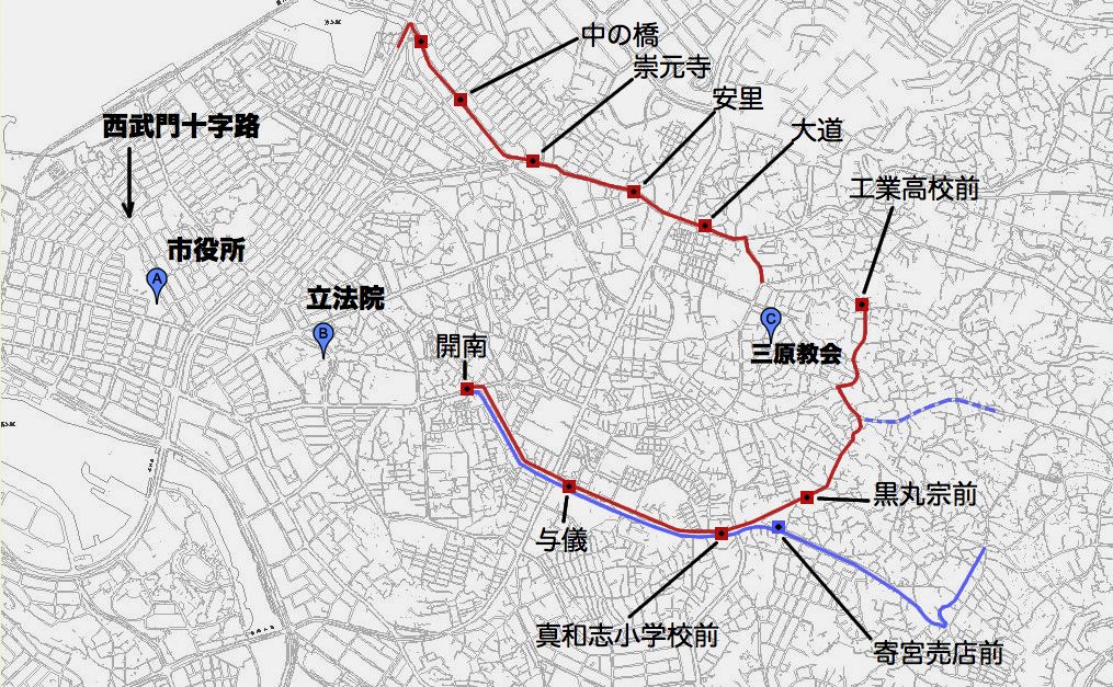 バス停の位置は変化しないだろうと思いますので使われてる(いた)バス停の位置を図中のバス停名に当てはめてその間をつないでみました。赤が松川線で青は識名線です。