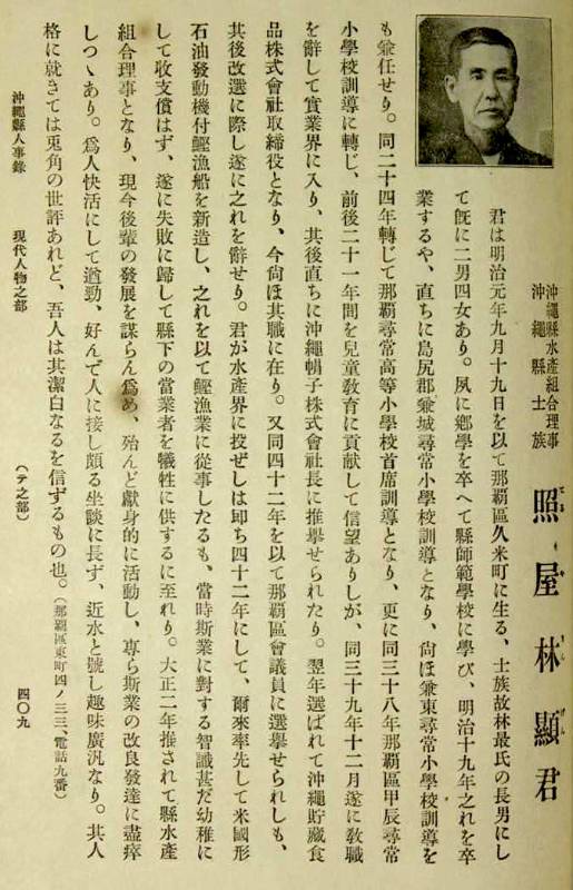 君は慶応3年那覇市久米町に生る。明治19年沖縄県師範学校を卒業し教育界に在ること21年、明治38年教職を退き実業界に入り沖縄パナマ製帽株式会社を設立その社長となり、傍ら食品会社専務に推さる。明治42年「水産立県」を念願、本県最初の発動機漁船照島丸を建造鰹漁業に乗出し、爾来水産会のため尽瘁して今日に至る。今や水産王として斯業の改良発展に貢献し功績偉大なるものあり。帝国水産会議員、県水産会副会長、那覇市水産会長、水難救済会那覇救難所長、製氷会社監査役等の要職にあり、水産功労者として昭和5年観桜御会、同7年観菊御会お召の光栄に浴し、大日本水産会伏見総裁宮殿下より表彰され昭和11年帝国水難救済会総裁宮殿下より二等有効賞親授さる。