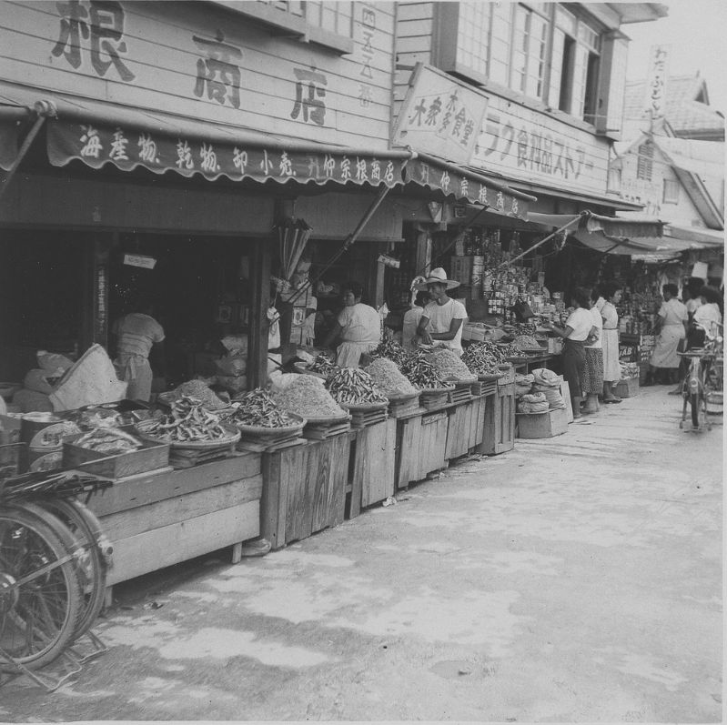 仲宗根商店、大衆食堂 木多、キラク食料品ストアー、奥に小さくマーケットと読める看板(後述)があります。