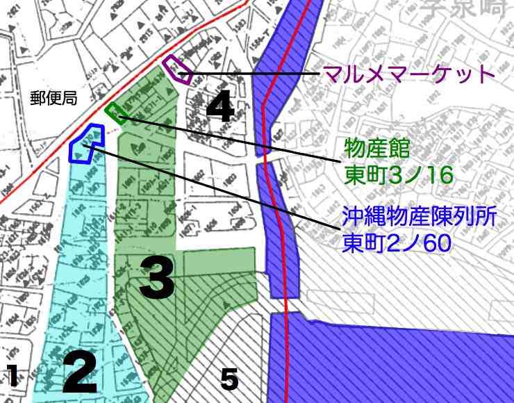 昭和4年の番地図を参照して沖縄物産陳列所と物産館、マルメマーケットは住所はわからないので他の図を参考にしました。