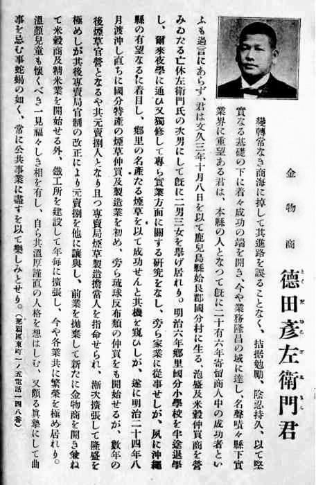 君は文久3年を以て鹿児島県姶良郡国分村に生る、泡盛及び米穀仲買商を営みゐたる亡休左衛門氏の次男にして既に二男三女を擧げ居れり。明治6年郷里国分小学校を半途退学し、自体夜学に通ひ又独習して専ら実業方面に関する研究をなし、傍ら家業に従事せしが、夙に沖縄県の有望なるに着目し、郷里の名産なる煙草を以て成功せんと其機を窺ひしが、遂に明治24年8月渡沖し直ちに国分特産の煙草仲買及製造業を初め、傍ら琉球反布類の仲買をも開始せるが、数年の後煙草官営となるや其元売捌人となり且つ専売局煙草製造○当人を指命せられ、漸次拡張して隆盛を極め士が其後専売局官制の改正により元売捌を他に譲与し、前業を抛棄して新たに金物商を開き兼ねて米穀商及精米業を開始せる外、鉄工所を建設して年毎に拡張し、今や各業共に繁栄を極め居れり。