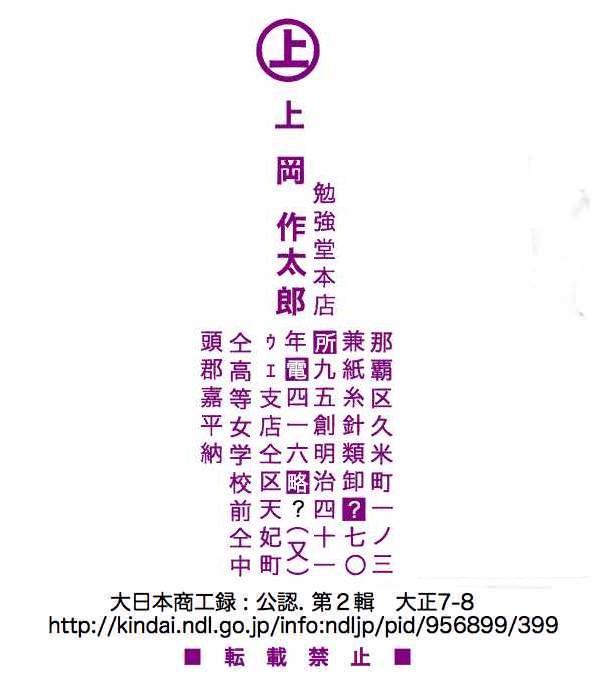上岡作太郎の部分。わからない文字は“?”にしてあります。昭和2年の勉強堂の広告でも糸類関係の扱いがありました。