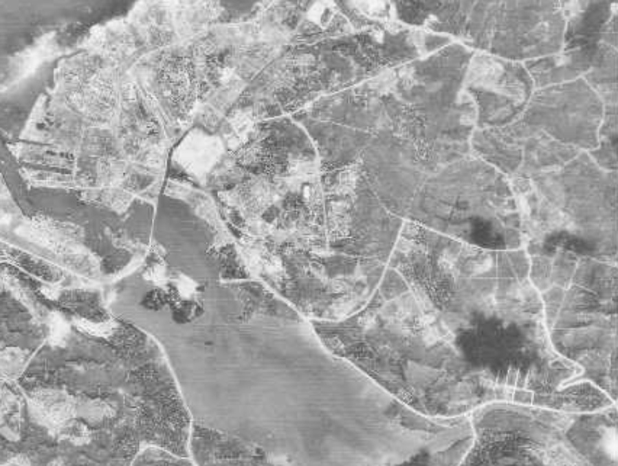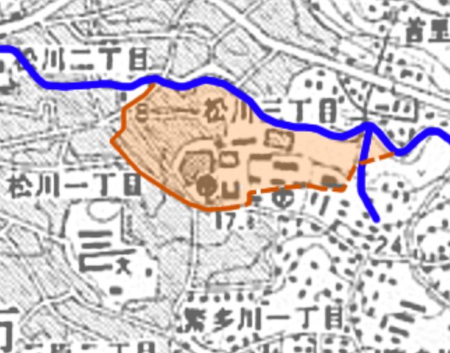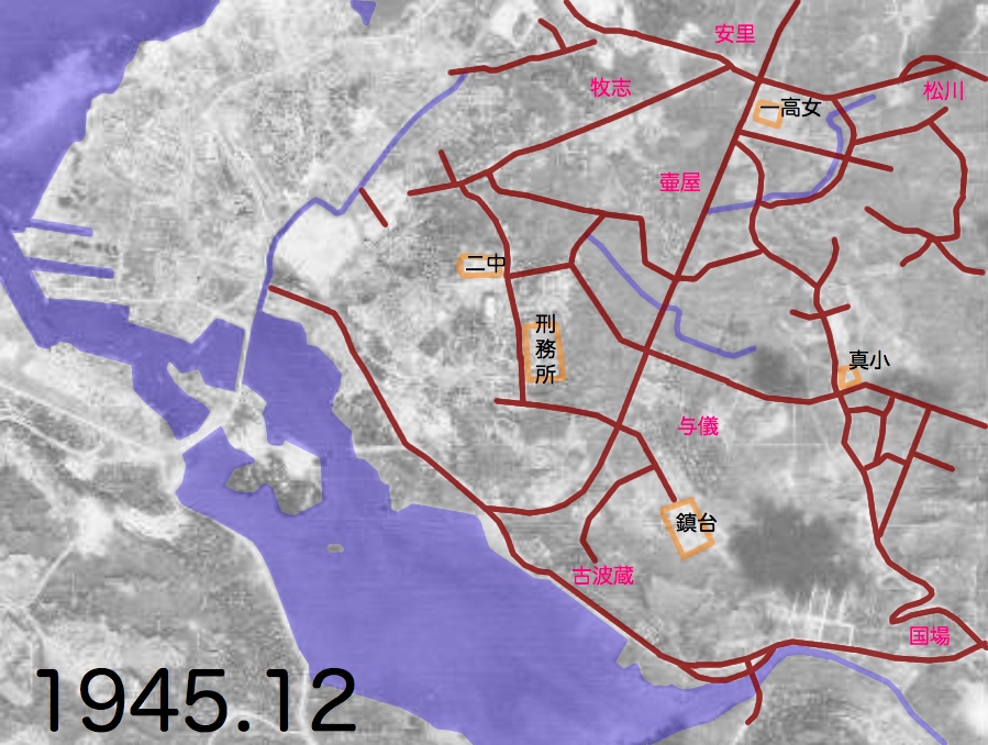 元の図は「1947年頃の地形と遺跡分布」というものなのですが、多和田川の河口が現在の合流地点とは違います。しかし現在の河口地点にも入り江がありますので小さな流れを改修してそちらに合流するようにしたのかもしれません。