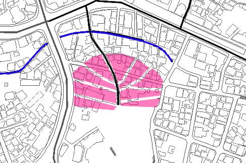 このピンク色の敷地の形は真ん中を通っている道路を中心として作られたのが想像できます。現在の道はこの敷地をいくつか横切る形でまっすぐ通っているのですが、このような道は境界線上にできる自然発生的な道とは違ってなんらかの意志がないと作られないかと思います。