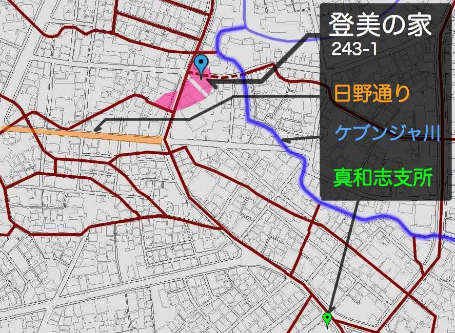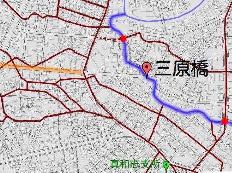 図は日野通り付近で茶で示された道は旧道です。オレンジが日野通りで強調された青色がキブンジャ川になります。三原橋完成以前は赤い点で示した橋まで大回りしなければならず不便です。