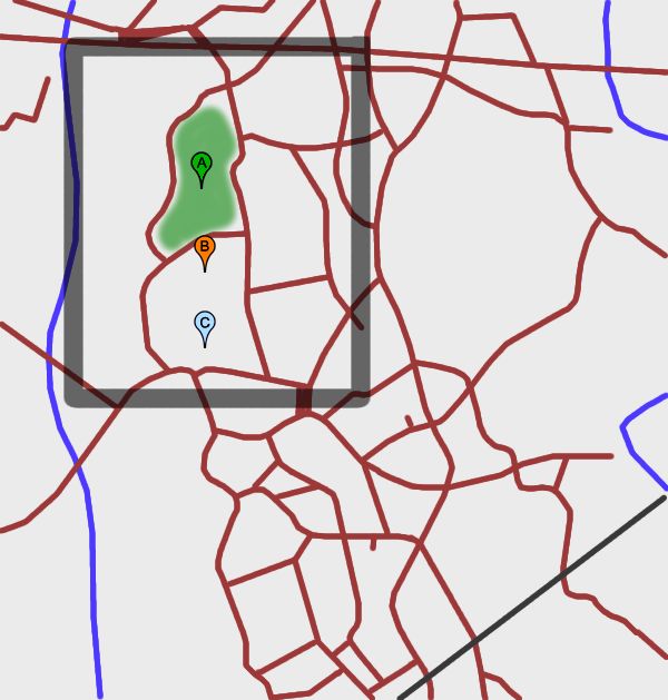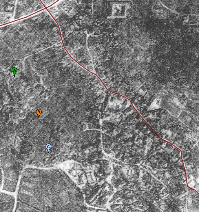 門中墓地(A)、二ツ松尾(B)、一ツ松尾(C)を書入れたもの。