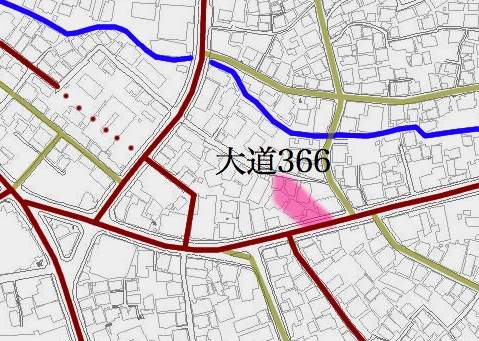 元図は今もある道が描かれています。しかしその道のうちのいくつかは薄く描かれていて図では茶緑色で描きました。元図で薄く描かれた道が何なのかということですがこれは新しく造られた道だと判断しました。理由は、番地を分断するように通っていたり、T字路を十字路にするようになっていたり、やたらと直線的だったりというところから妄想しました。