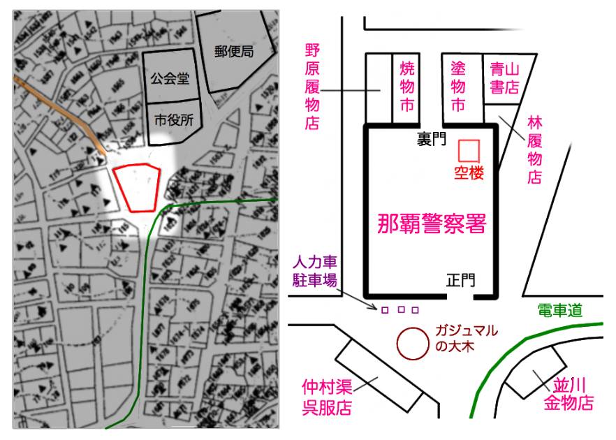 http://naha.machitane.net/old_photo.php?id=1043まちのたね通信の写真は大門通りを北から南(久茂地から西町)に向けて撮影したものです。下図では右から左になります。