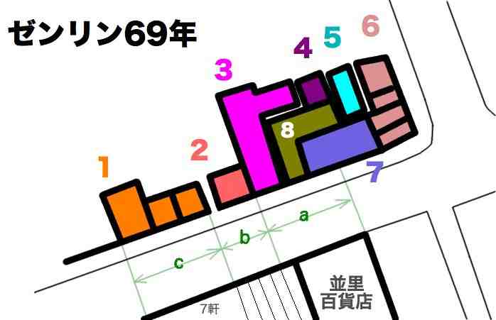 かどや食堂/むつみ堂時計店/なみざと百貨店/いづみ写真館/とおま洋装店/だいわ靴店/アンデス商会/富士写真商会/ポーラ ビュティサロ[ママ]/山本茶舗/琉球料理三好/古雅堂印房/中央時計店/まるとも洋品店/アニヤ眼鏡店/のざき洋装店/呉ラジオ店/ちねんふとん店/前田宝石/幸地時計店/カステラの長崎本舗/にしきや/みなみ屋/むつみ写真館/玉宮/国際時計店/ベルモード/まるみや/丸忠御土産品店/松坂屋ゼンリン地図69年版との違い。
