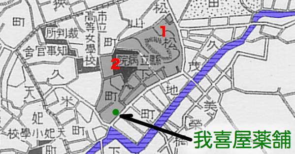 「戦前の久茂地村民俗地図」では「我喜屋(くすり)」と書かれていますが、昭和初期の那覇市街図(国場組社史掲載)では「我喜屋薬舗」と書かれています。