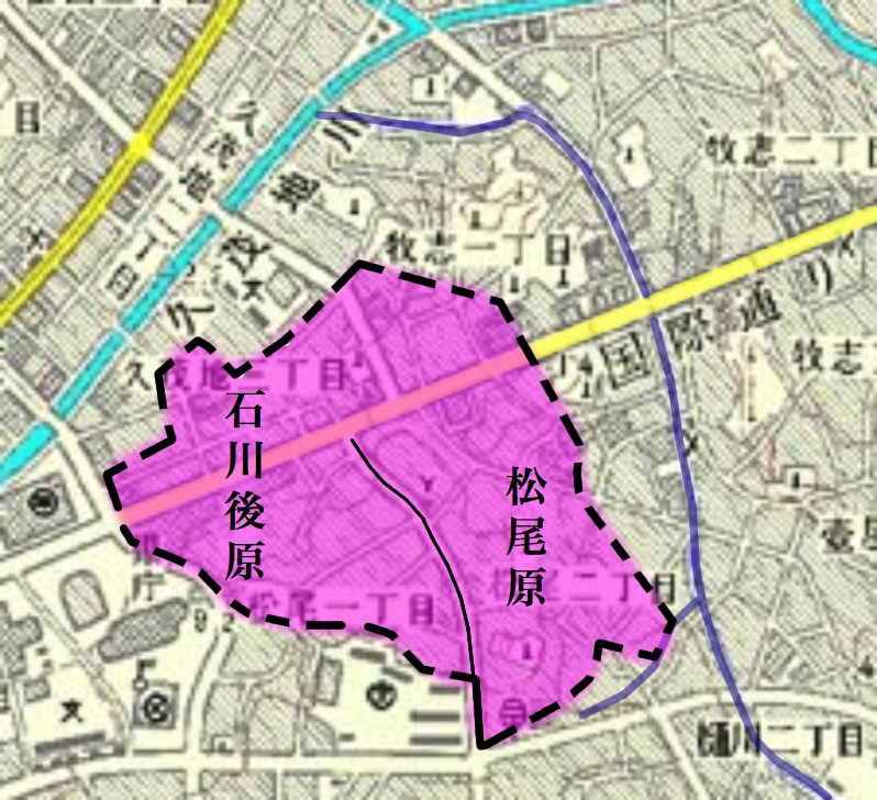 那覇民俗地図では古波蔵部落の脇に「島尻農学校敷地(現古蔵中学校)」と書かれており、写真では川にグラウンドのようなものが見えます。民俗地図の想定は昭和初期で写真は米軍撮影ですからこの期間に埋立をしたのかもしれません。