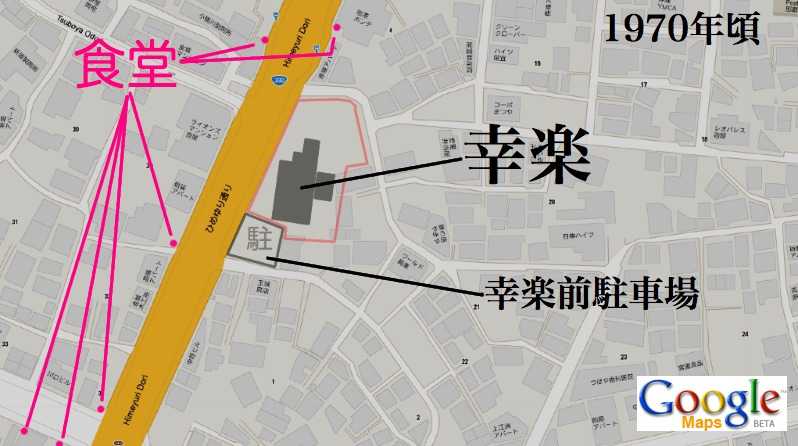 参考にしたのは70年頃のゼンリン地図です。GoogleMapで見るとマクドナルドのあるビルはメゾン幸楽となっていますね。