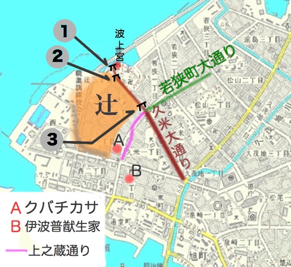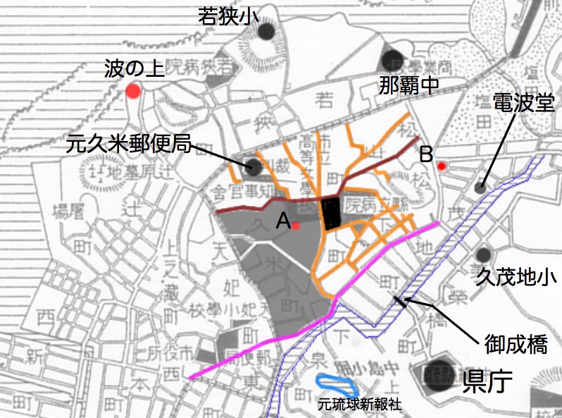 たとえば西武門が波上宮の参道入り口であったこと、そこから波上宮までの道に灯籠があり事実上「お宮の空間」をなしていた事などは今現在の自分自身の意識には全くありませんでした。この事実を意識して、改めて那覇の街をみた場合、若狭町を除く上之蔵通りから若狭町大通りの向こう側は辻と波上宮で神域と特殊地域であり庶民の通常生活とはすこし違った地域だったのだなと考える事が出来ます。