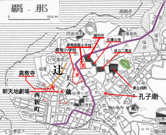 「那覇尋常高等小学校-裁判所-孔子廟-大典寺(県立病院裏)-潟原交番前(現松山交差点付近)」に連なる丘陵地帯はワシントンホテルから商業高校を越え松山交差点付近につながる地帯ですが丘陵とよべるような高台はありません。ゆるやかに少し高くなってはいますが...
