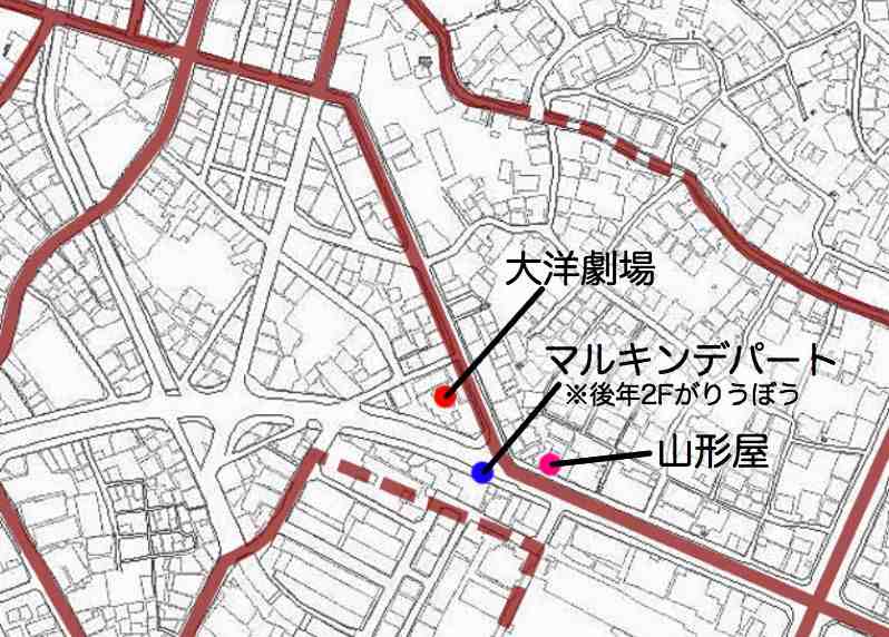 この那覇市地図は手書きの概略図のようなものであまり正確ではありませんが、大洋劇場の横にマルキンデパート(二階にりうぼう)、マルキンデパートの道向かいに山形屋があったというのはかろうじてわかります。ということで最初に示した図もその程度だということを了解ください。