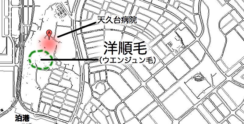 港原は三番毛と二番毛の北側で、東側の兼久原とは安謝集落の一番毛と二番毛の間を北に向かう道を境にしています。