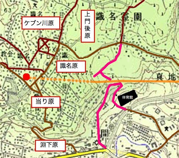 右写真では軍用地内の旧道を紫のラインで示しています。