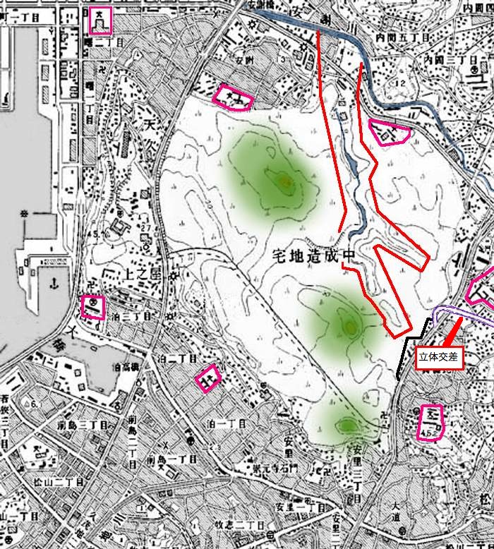 学校はピンクで表していて中央右側の切れている学校は興南高校ですが、返還前はその横にある道路へバイパスから右折するのには立体交差を使いました。現在はループ部分が撤去され新都心へそのまま直線的に進むようになりました。