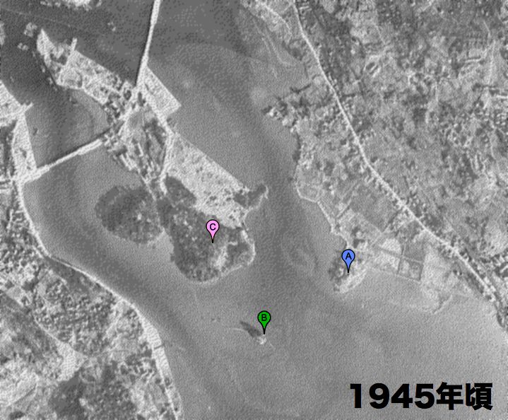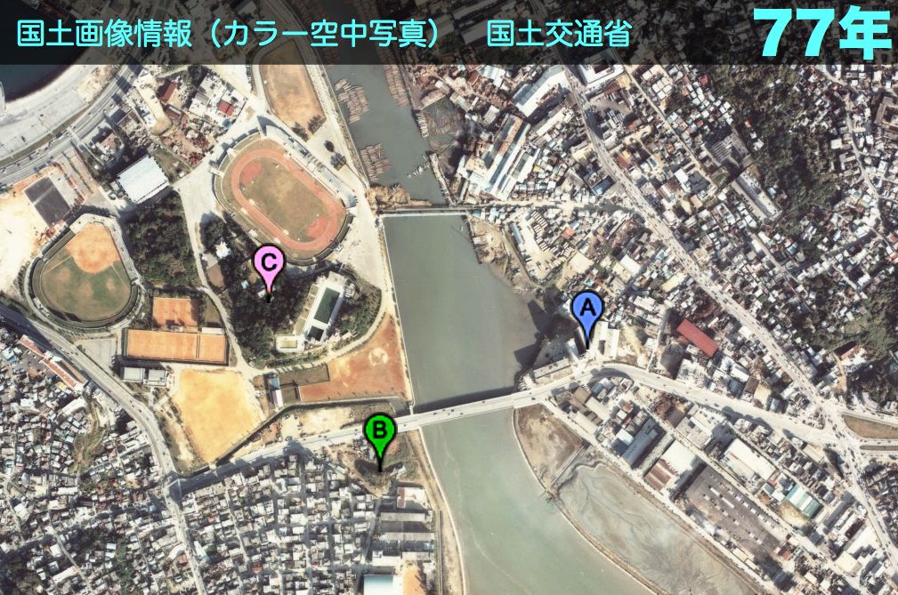 http://w3land.mlit.go.jp/cgi-bin/WebGIS2/WC_AirPhoto.cgi?IT=p&DT=n&PFN=COK-77-1&PCN=C59&IDX=7&PNO=1,2,3,4,5,6,7,8,9,10,11,12,13,14,15,16,17,18図中のAがアカバタキー(赤畑)、Bがガーナ森、Cは奥武山です。真和志民俗地図では古波蔵交差点からAを経て橋に至る道は戦後の道路となっています。