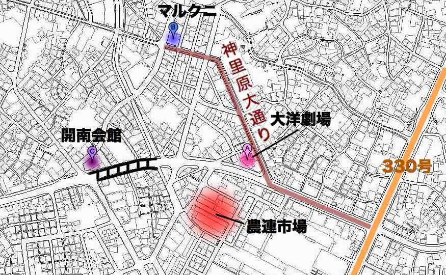 紫ポインタは開南会館、赤は農連市場です。