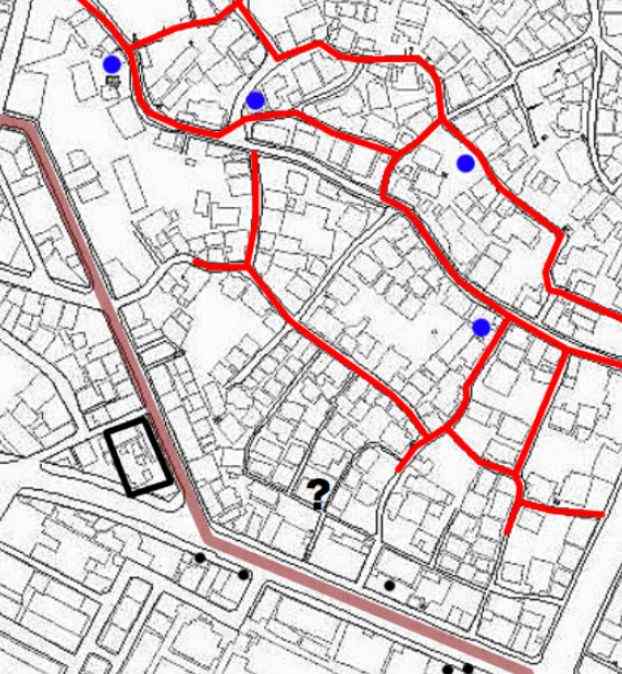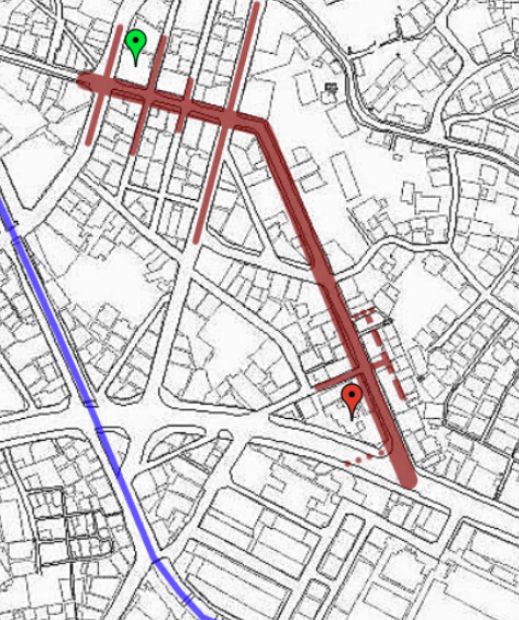上図は三十一図から三十三図の三つの図をつないで描いたものですが、最初の図でわかるようなカーブが一切ありません。これをどうやって解読するのかということになるんですが、図中に存在し後年の地図で位置が特定できる箇所(例:大洋劇場)や他の道との関連性を考えて推定します。故に推定が間違っていたら狂います。そのへんご了承頂きたく。