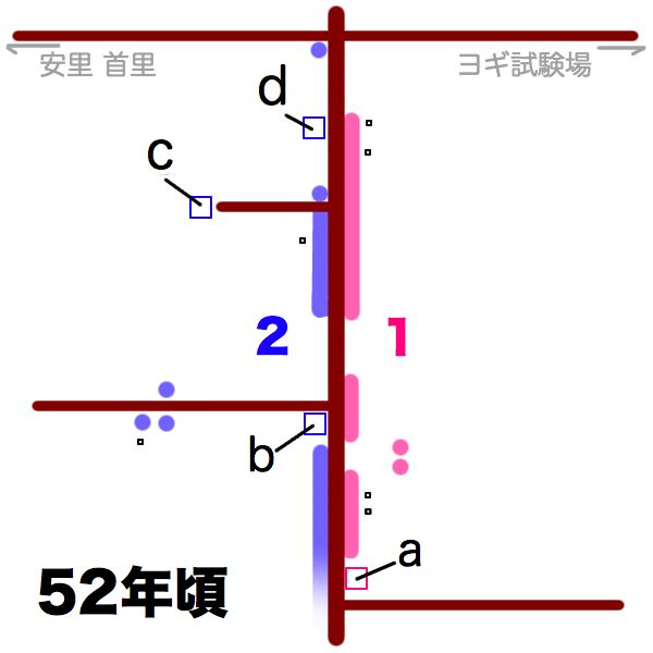 最初の図で黒く描いた開南会館と農連の間の道は50年代にはありません。ゼンリン地図69年版でも未だ開通しておらず、予定地として白くなってます。