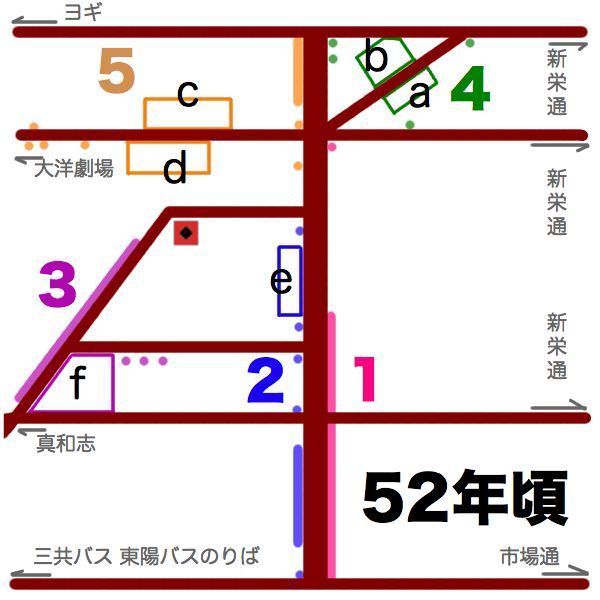 大洋劇場へ向う路地が左側で新栄通りに向う路地は右側になるのでこれであたっているのだと思います。しかし神里湯のある道あたりはどうも第三十四図とは違うようにしか見えません。
