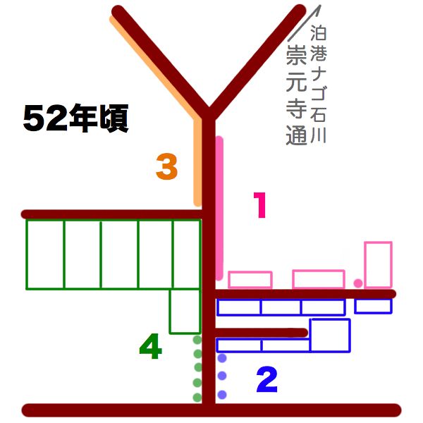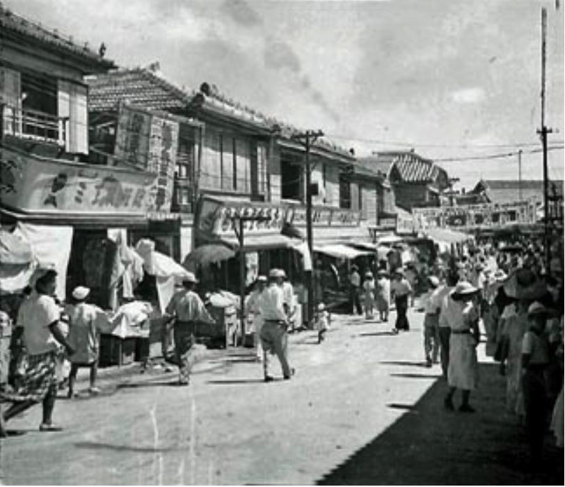 この写真の場所はわからなかったのですが、コメントで教えていただいた写真をもとに地図などを確認して写真の場所特定ができました。左写真で通りの左側中央にある看板は「高良楽器」で現在のマルタカレコードです。だいたい同じ位置からのストリートビューはこんな感じ(