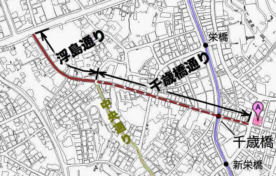 Googlemapでは南島製菓の前に浮島通りの表示がありますが、昔はあの位置は千歳通りになっています。