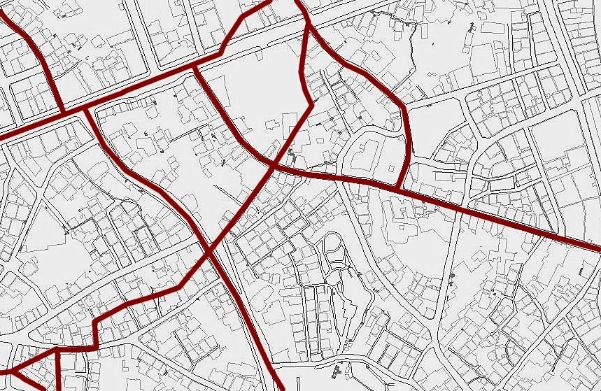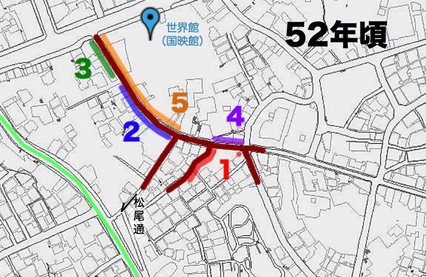第五図が「松尾派出所中心 ニューパラダイス分岐 - 中央通り分岐路」、第二十四〜二十六図が千歳橋通りとなっていて、第二十六図では上図で示した箇所が浮島・千歳両通りの境になっています。