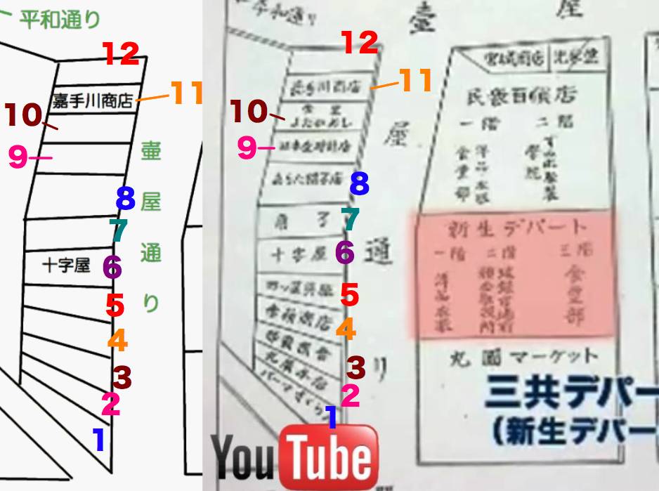 向い側(5)は浮島通り側から丸国デパート、三共デパートとなっています。
