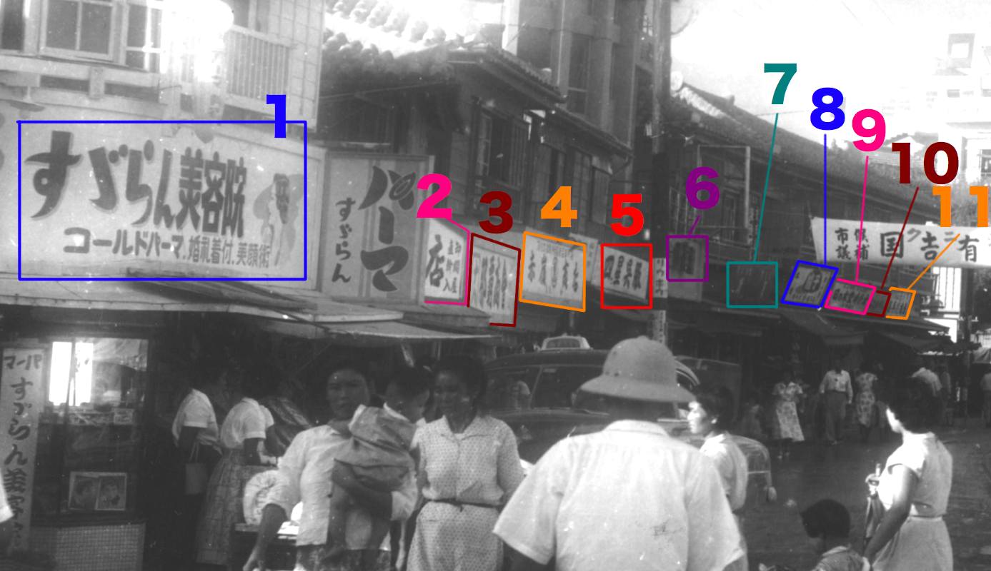 赤田時計修理所/義手義足製作修理、土井ラジオ店、更科食堂、上原商店、大城雑貨店、大城食堂、花井書店、山本雑貨店、宮里商店(角)4は丸国マーケット向かい。
