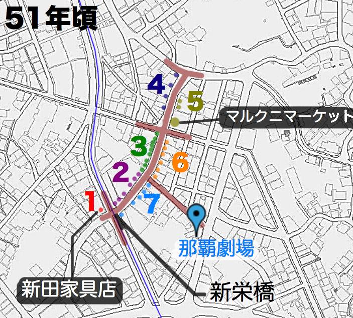 三十四號商会、六六商会、新田商店、毎日マート、久銘次商店、渡久地商店7は中間から新栄橋まで