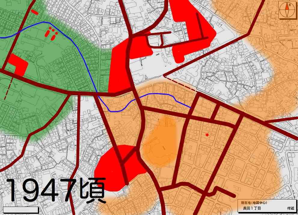 最後に「戦前の字寄宮民俗地図」での畑(緑)と住宅(ピンク)、農業試験場敷地(グレー)を模写したものをあげときます