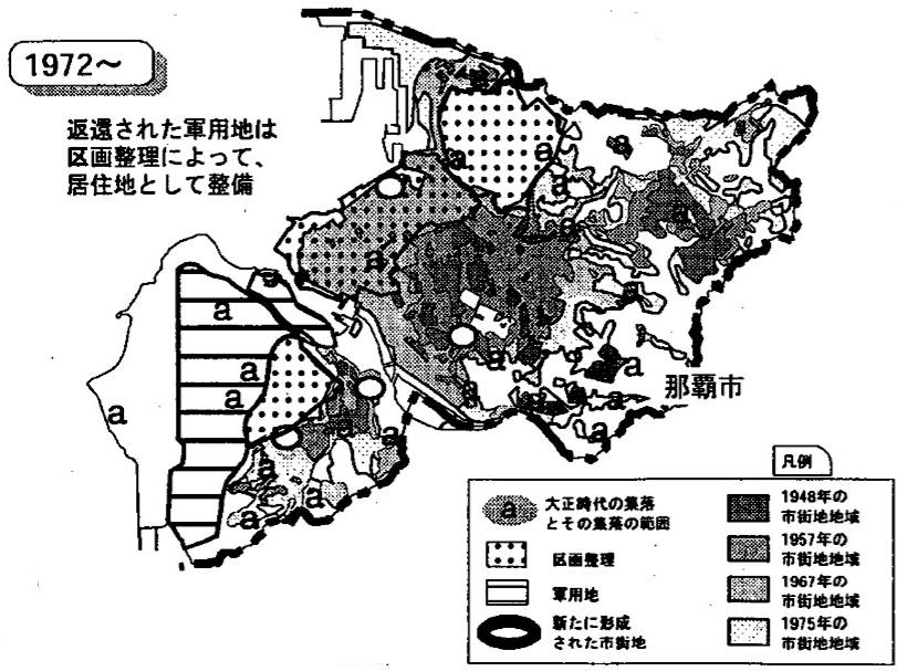 戦後すぐの寄宮で扱った「那覇復興地図」を基にした図で、オレンジが荒地、緑が水田、赤が住宅、茶が道で破線になっているところは庭園路です。