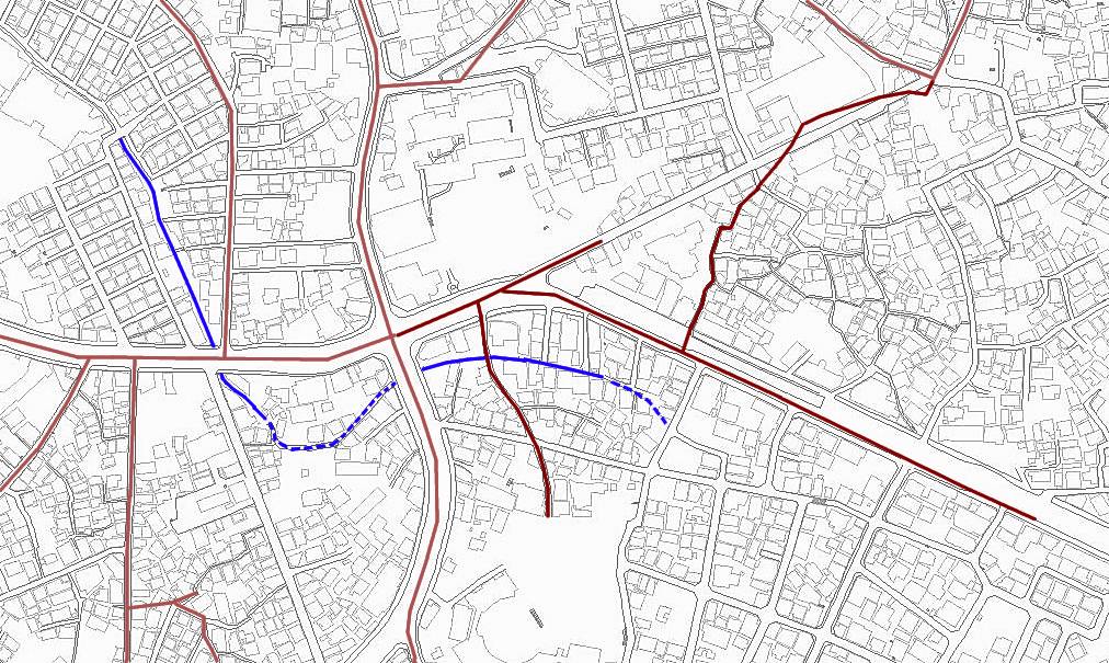 このピンク色の敷地の形は真ん中を通っている道路を中心として作られたのが想像できます。現在の道はこの敷地をいくつか横切る形でまっすぐ通っているのですが、このような道は境界線上にできる自然発生的な道とは違ってなんらかの意志がないと作られないかと思います。