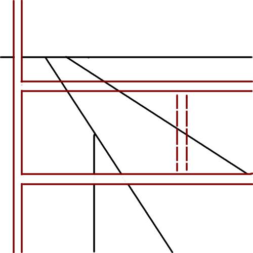 「戦前の字寄宮民俗地図」でも道の表示は敷地の線の上を重ねるように描いてあり他の道とは違います。右図はその様式で、黒が敷地、上にある茶の横線が敷地の境界線を消さずにそのまま書かれたもの(1)、その下が敷地の境界線を消して書かれたもの(2)、そして上下を結んでいる破線が戦後作られた道路(3)です。