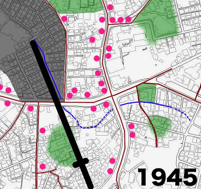 このピンク色の区分けは土地の区分だと思うのですが現在もそれに準じた形で住宅は存在しています。この辺り一帯の碁盤目でない住宅地はほとんど「戦前の字寄宮民俗地図」に見える敷地の形そのままです(区画整理がおこなわれていない)。