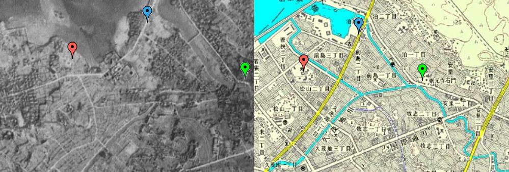 https://picasaweb.google.com/lh/photo/bdE8NEBS6_oinbq-U_KESQこの彩色写真は安里から牧志方向に向って撮影されています。彩色写真には上図につけた説明はありませんが、ほぼ同じアングルで撮影された別写真についている説明を流用しました。
