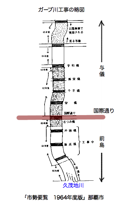 Images of Okinawa after World War IIでは1968年とされていて、60年代にガーブ川の改修は行われていますから一応大体の年代はあっています。しかし後述するタイムスの写真では65年には沖映通りのガーブー暗渠化は終了しています。